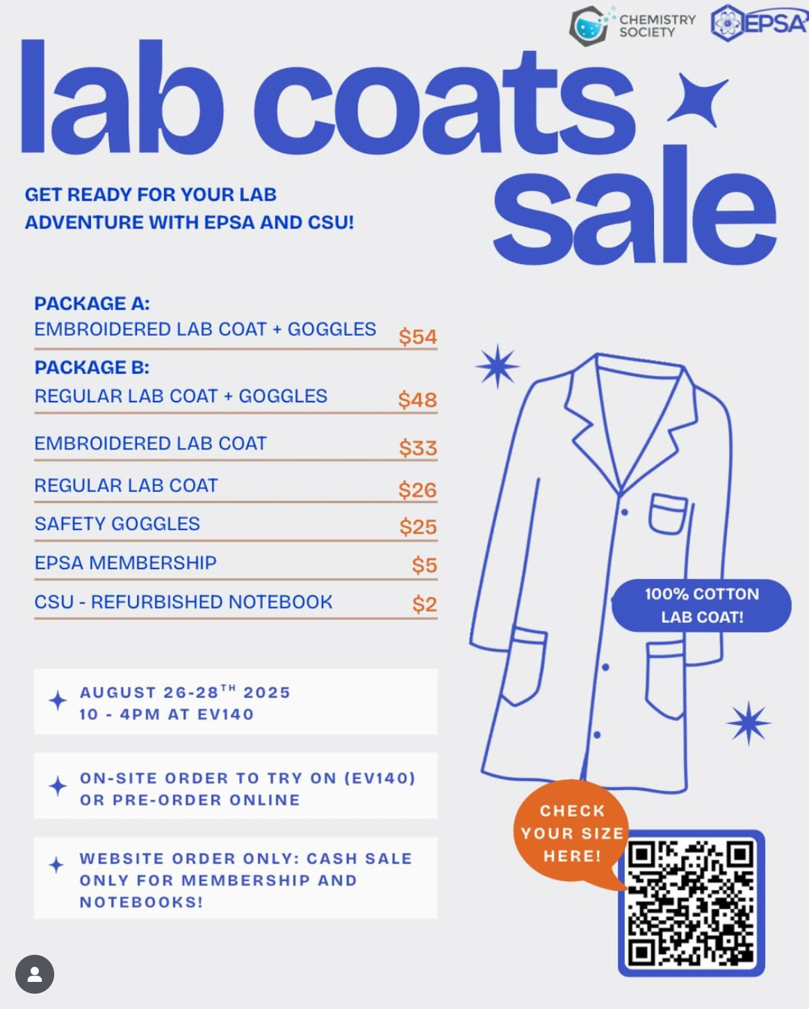 Forgot your lab coat or splash goggles? No worries! EPSA is here to help. We offer lab coat rentals and goggles to ensure you’re fully equipped for your lab sessions. Learn more here.