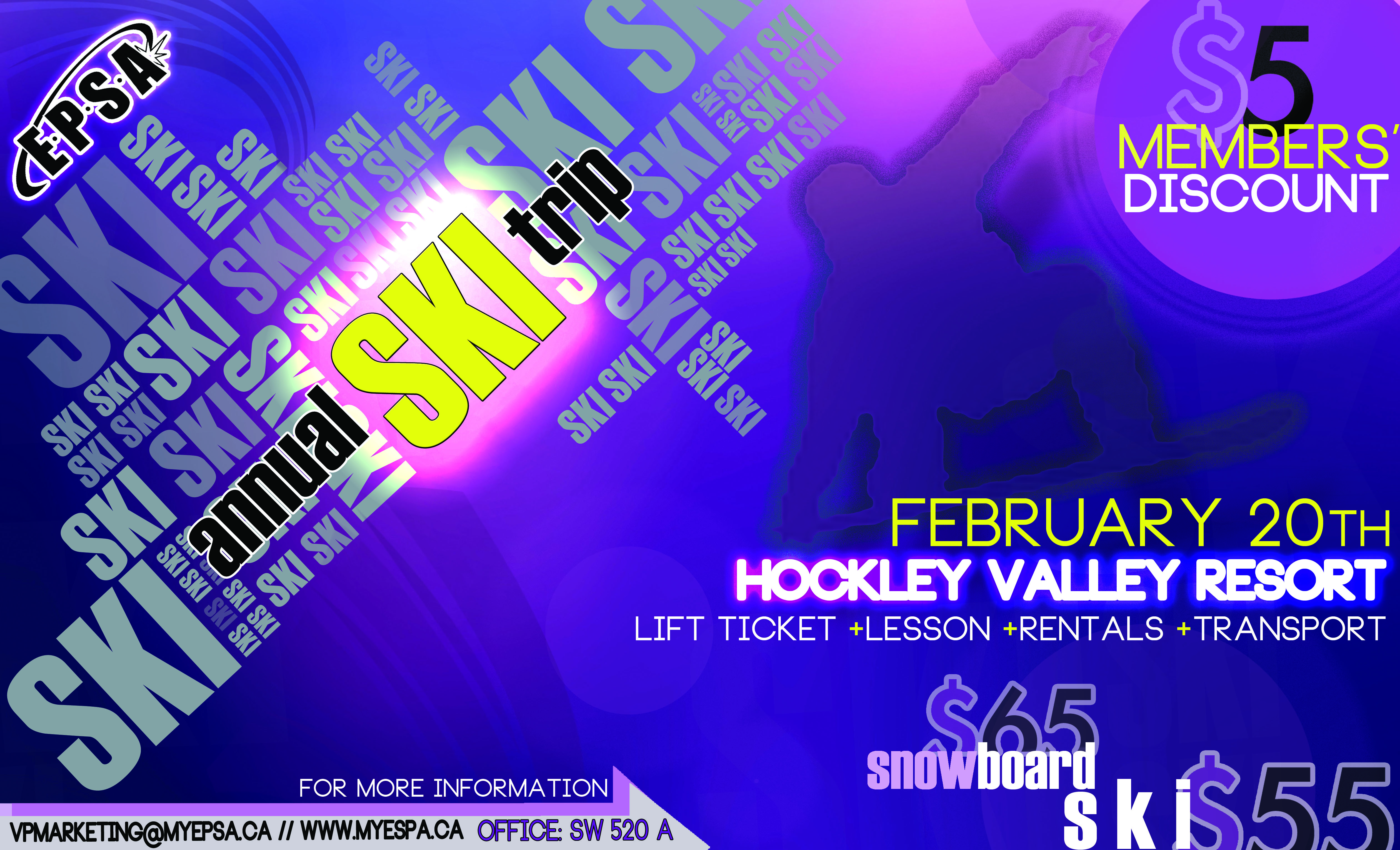 Looking for something fun to do during Reading Week? Join the Environmental and Physical Sciences Students Association (EPSA) for our annual ski trip to Hockley Valley Resort on Wednesday, February 20, 2013! Hockley Valley Resort is all the way in Orangeville, ontario.