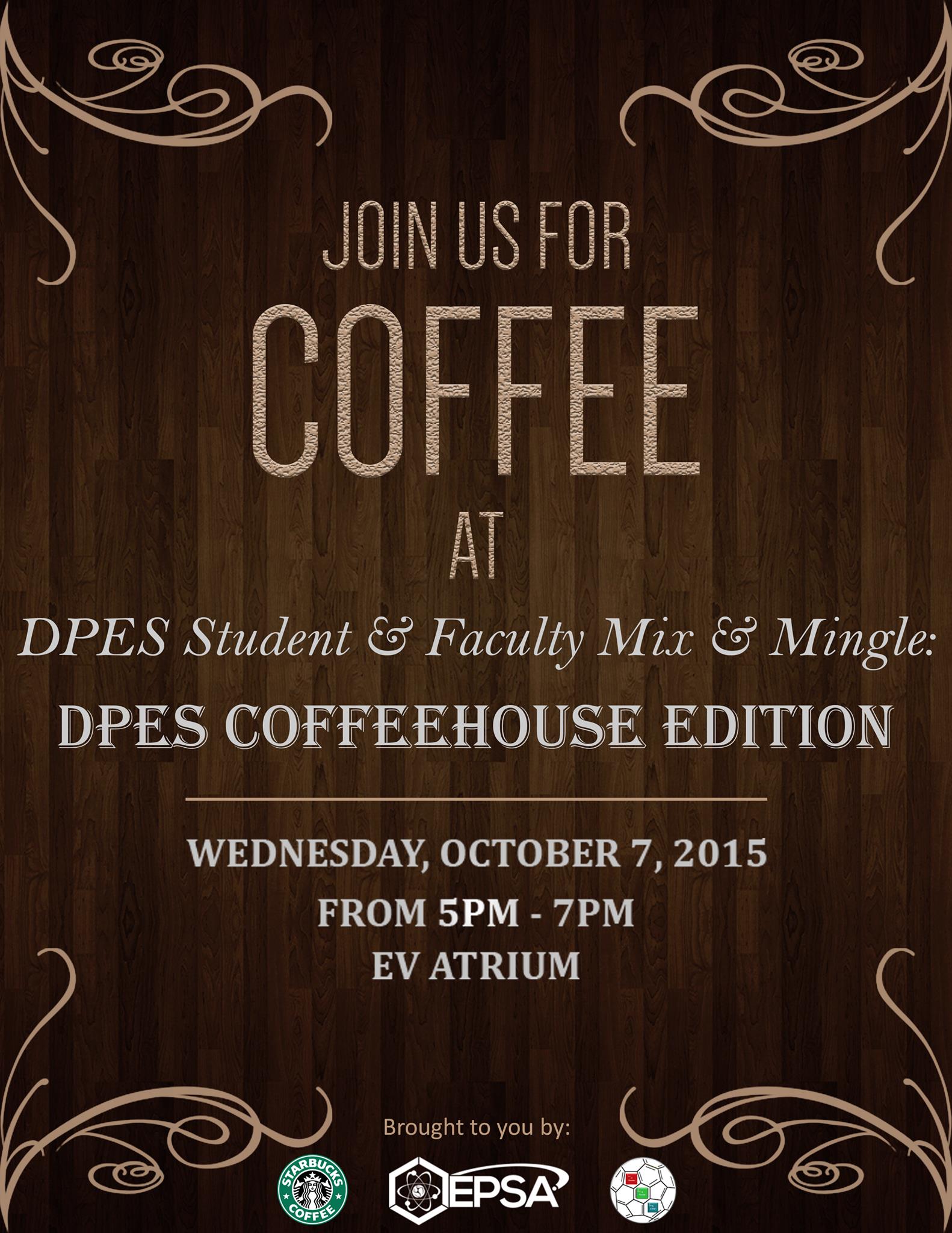 Join us at the EV Atrium on Oct. 7 from 5PM – 7PM for an evening of merriment, food, coffee, and great conversation with DPES faculty! Get to know your intriguing profs outside of the class!
