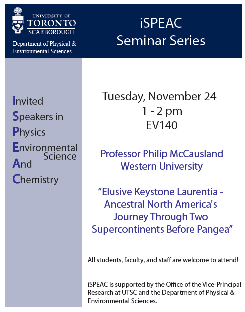This week’s invited speaker for DPES’s iSPEAC (invited Speakers in Physics, Environmental science, And Chemistry) Series will be Tuesday(tomorrow) afternoon at 1-2 pm in room EV140.  This week’s speaker is Dr. Philip McCausland from the Department of Earth Sciences at Western University who will be giving a talk on “Elusive Keystone Laurentia – Ancestral North America’s Journey Through Two Supercontinents Before Pangea” (see attached poster).