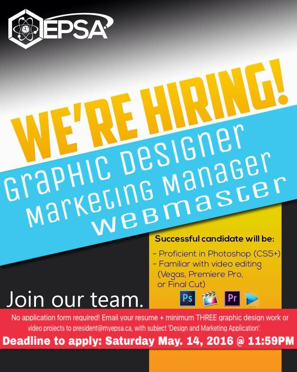 Calling all creative individuals with a passion for Graphic design and Photoshop skills, EPSA needs you! Want to join the EPSA team and gain valuable teamwork experience while creating a new and innovative EPSA look! Now’s your chance to join the 2016/2017 Executive Team! All contact and application information is posted below! Deadline to apply is Saturday, May 14th, 2016. Please e-mail your questions to epsa@utsc.utoronto.ca