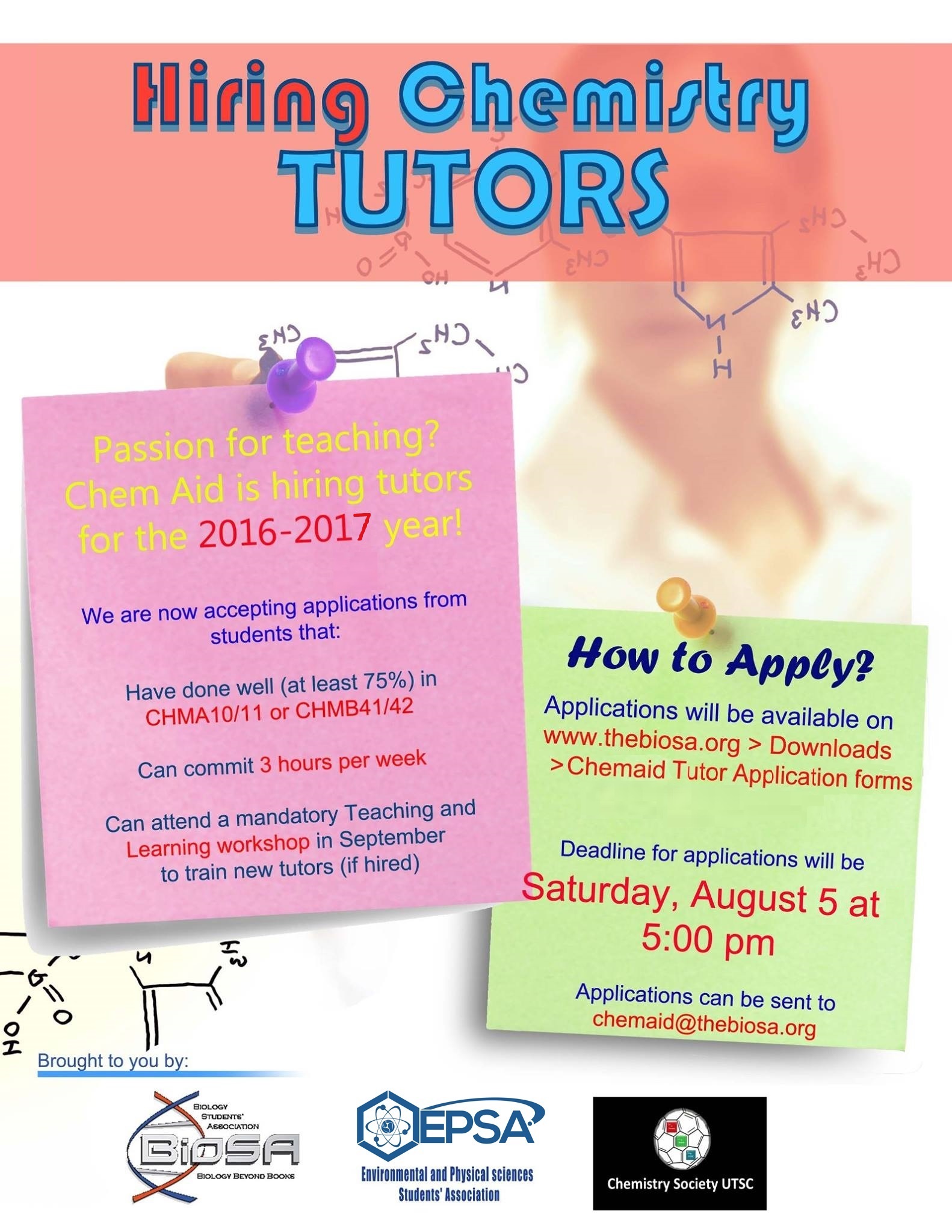 The ChemAid Centre is looking for passionate and energetic students to tutor CHMA10/11 and CHMB41/42 for the Fall 2016 and Winter 2017 semester! Application forms are due on Saturday, August 5th at 5PM