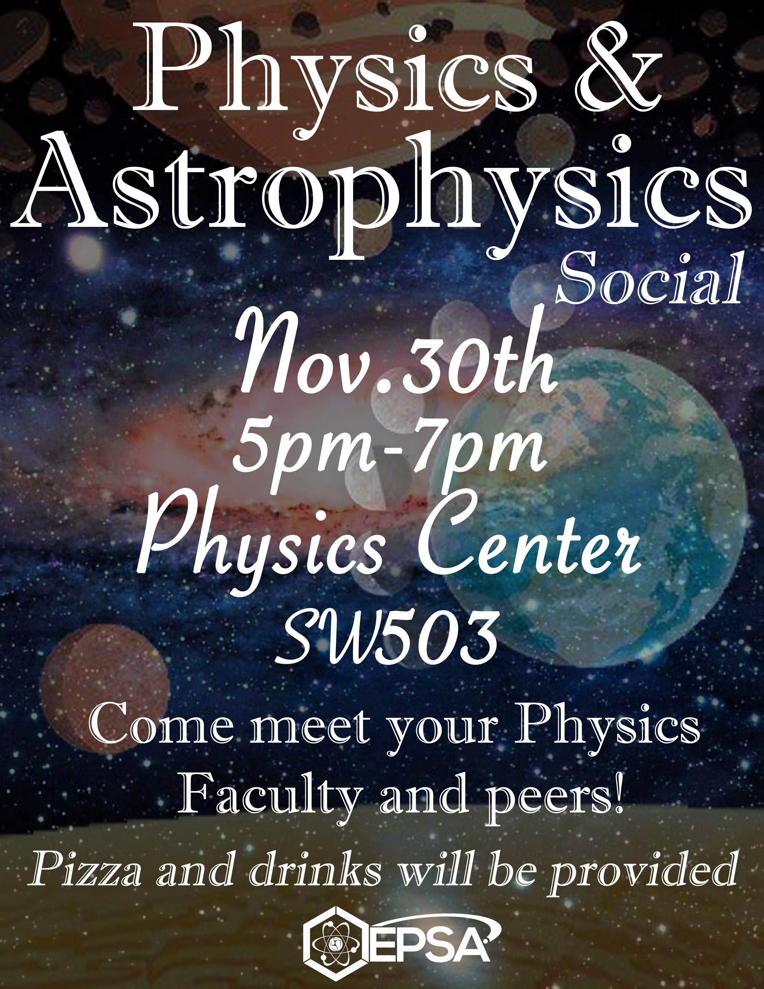 Physics & Astrophysics Social! Nov. 30th, 5PM, SW503by WebmasterNovember 22, 2016Join EPSA and the Physics & Astrophysics Discipline,