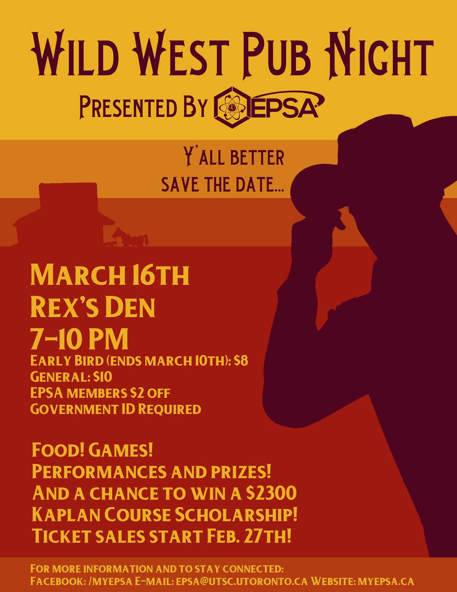 EPSA is holding another Winter social this year and you are all invited. This year, EPSA is presenting you with the “Wild West Pub Night”! This event will be taking place on March 16th at 7 PM in The Rex’s Den. Make sure to come out and enjoy drinks, food, performances, and a chance to win a $2300 scholarship from Kaplan!